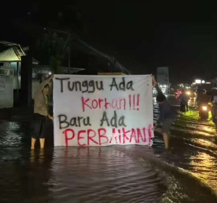 Spanduk tersebut bertuliskan pesan-pesan menohok, seperti “Tunggu ada korban baru ada perbaikan!!!” dan “Banjir sudah lama Pemerintah tutup mata”.