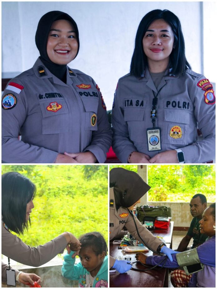 Di tengah kegiatan tersebut, IPDA dr. Chintya dan BRIPKA Ita terus melayani tanpa lelah. Senyum mereka menjadi pengingat bahwa pengabdian tidak selalu harus di garis depan medan konflik kadang, pengabdian paling berarti justru hadir lewat tangan yang menyentuh dan hati yang mendengar.